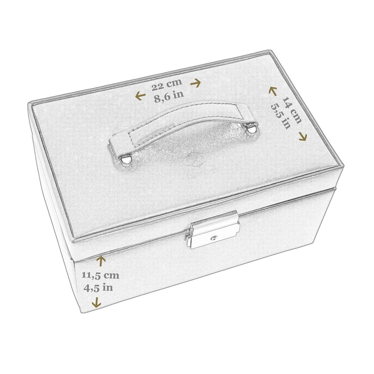 Vidus išklotas minkšta tekstile, kuri saugo auskarus, žiedus, vėrinius ir kitus vertingus aksesuarus nuo braižymosi. Aiški vidaus struktūra leidžia viską laikyti tvarkingai ir patogiai pasiekiamai.