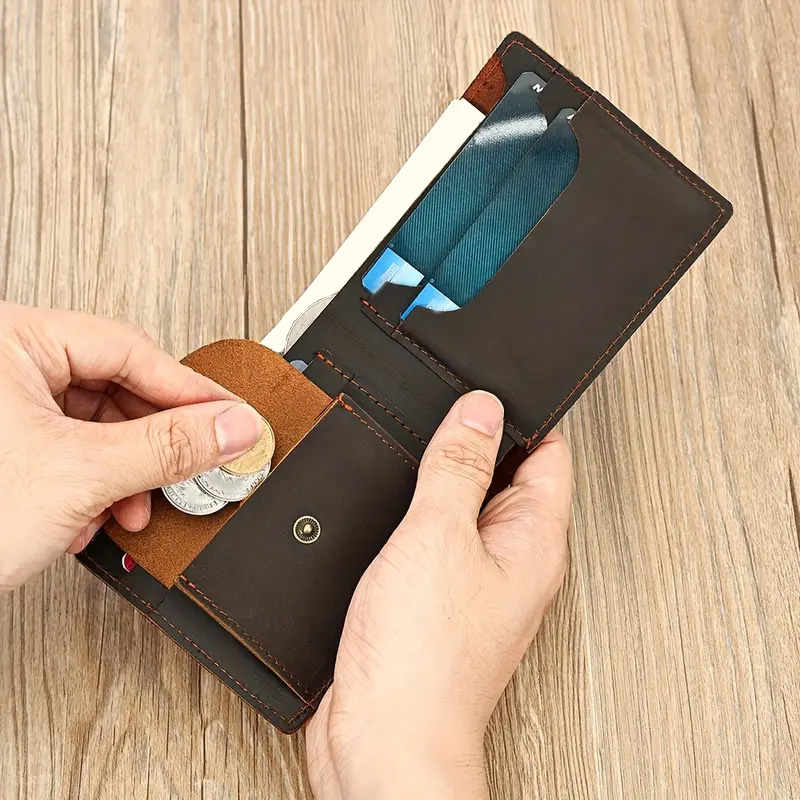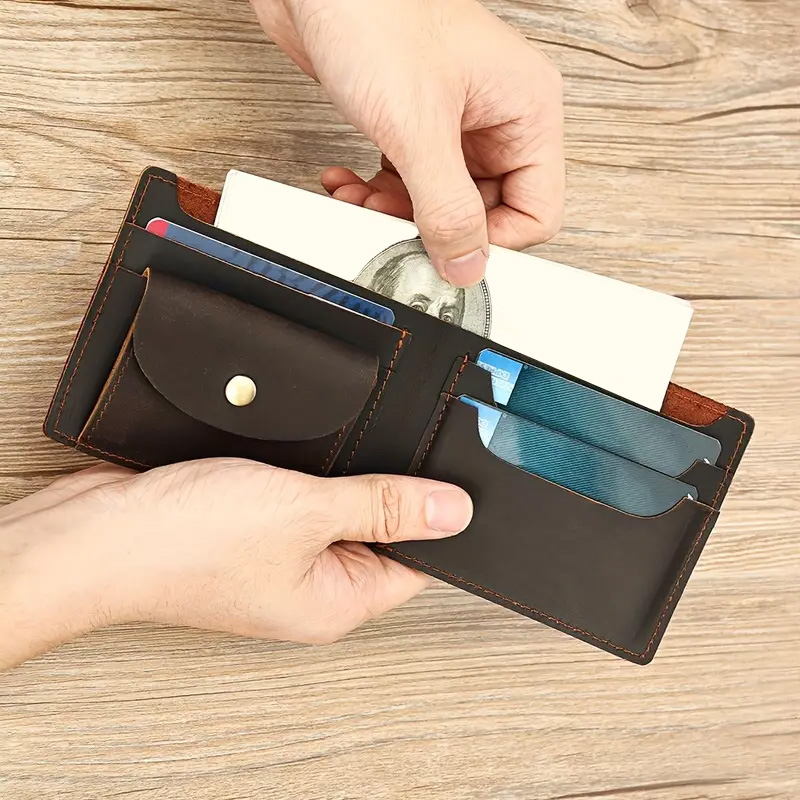 Vyriška piniginė su monetų skyriumi be užsegimo, pagaminta iš odos. Piniginė pagaminta iš natūralios odos